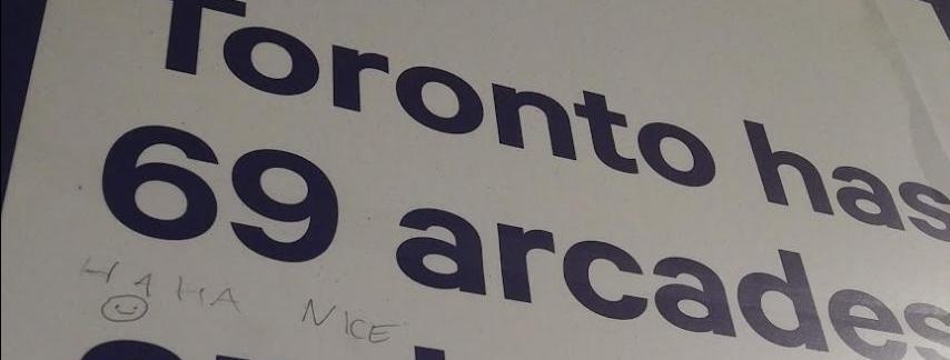 One of these ads stood out to me. It claimed "Toronto has 69 arcades," which struck me as an impossibly high number. Some of the numbers used in the ads are fanciful – one poster says "Toronto has 1 perfect apartment for rent and 987 people who want it" – so I suspected the 69 might be made up.