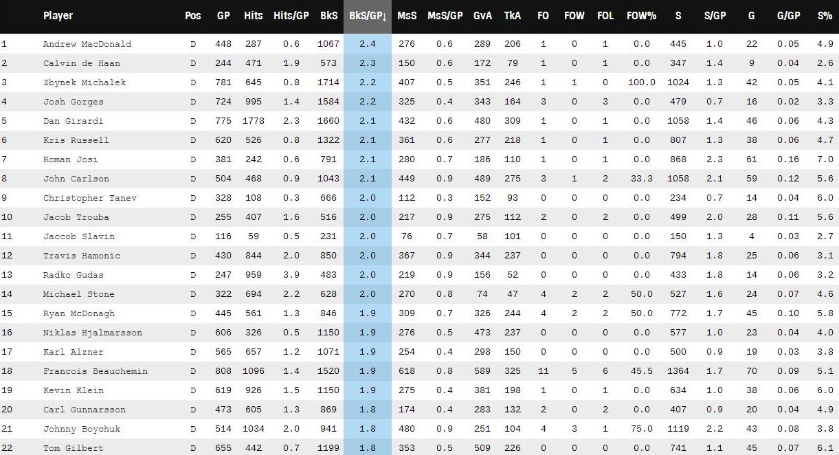 Blocking shots does not require skill. I might only be speaking to my personal preferences here, but there are things I want to see when I go to a hockey game - goals, smart passes, big hits - and blocked shots aren't one of them. If the idea in today's NHL is that games should showcase the skills of the league's best players, shot-blocking doesn't fit with that philosophy. As an illustration, I've compiled a list to show the current NHLers who make their bread and butter by blocking shots. I've sorted all active players with at least 100 career games in the NHL by blocked shots per game. Take a look: