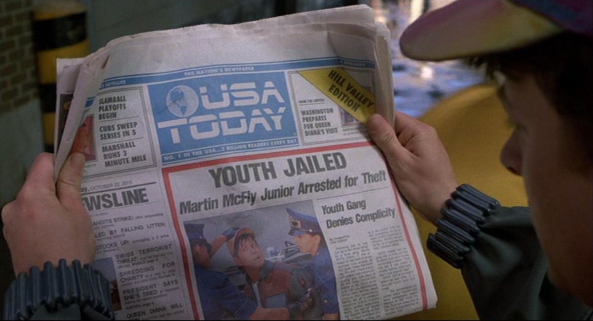 First of all, we see this is the Hill Valley edition of USA Today. This is probably a product placement thing as there is a lot of that in this movie, but it's important to note USA Today doesn't have hundreds of hyper-local regional editions like this. Also, the "3 billion readers" announced at the top, well, USA Today ain't reaching those heights. The $4 price is the most plausible thing about the paper itself, although that's pretty steep.