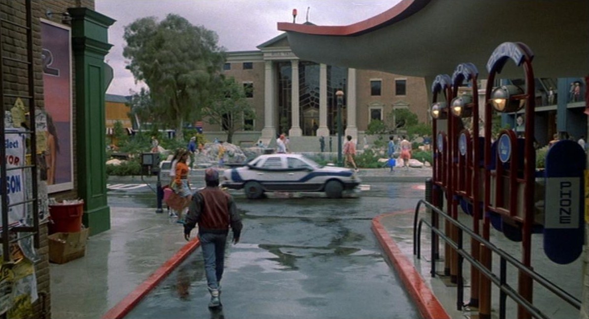 Finally we leave the alley, and we and Marty are confronted with a lot of visual information. First of all, at Marty's right is a set of futuristic phone booths. Phone booths don't look fundamentally different today than in 1989, but they are much rarer. There are also some funky changes made to the parking meters on the street, but we don't get a good look at them or how they work, so we'll give the movie a pass on those.