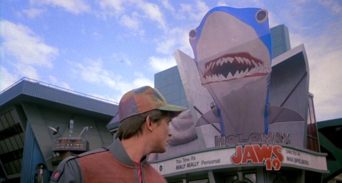 A giant holographic shark bites down on Marty outside a theatre showing Jaws 19 (and only Jaws 19). Where do we even begin here? Holograms don't work like this. There hasn't been a Jaws movie released since Jaws 4 in 1987, let alone 15 of them (although Universal has put together a fake teaser trailer for Jaws 19 that talks briefly about all those missing sequels). Steven Spielberg's son Max is listed on the marquee as the film's director, but he's never directed a movie. Single-screen theatres are a rarity today. If there was anything I'd give a 0/10 to, it'd be this, but the floor is 1/10, so this gets a big fat 1.