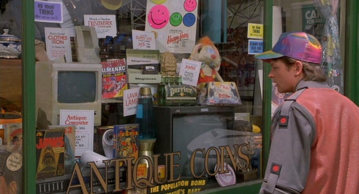 We then see an antique store selling stuff from the 1980s like video games, a Roger Rabbit doll and a Dustbuster. While stuff like old video games and the Roger Rabbit toy have value for collectors today, we don't call them antiques. 6/10 as it sorta gets things right.
