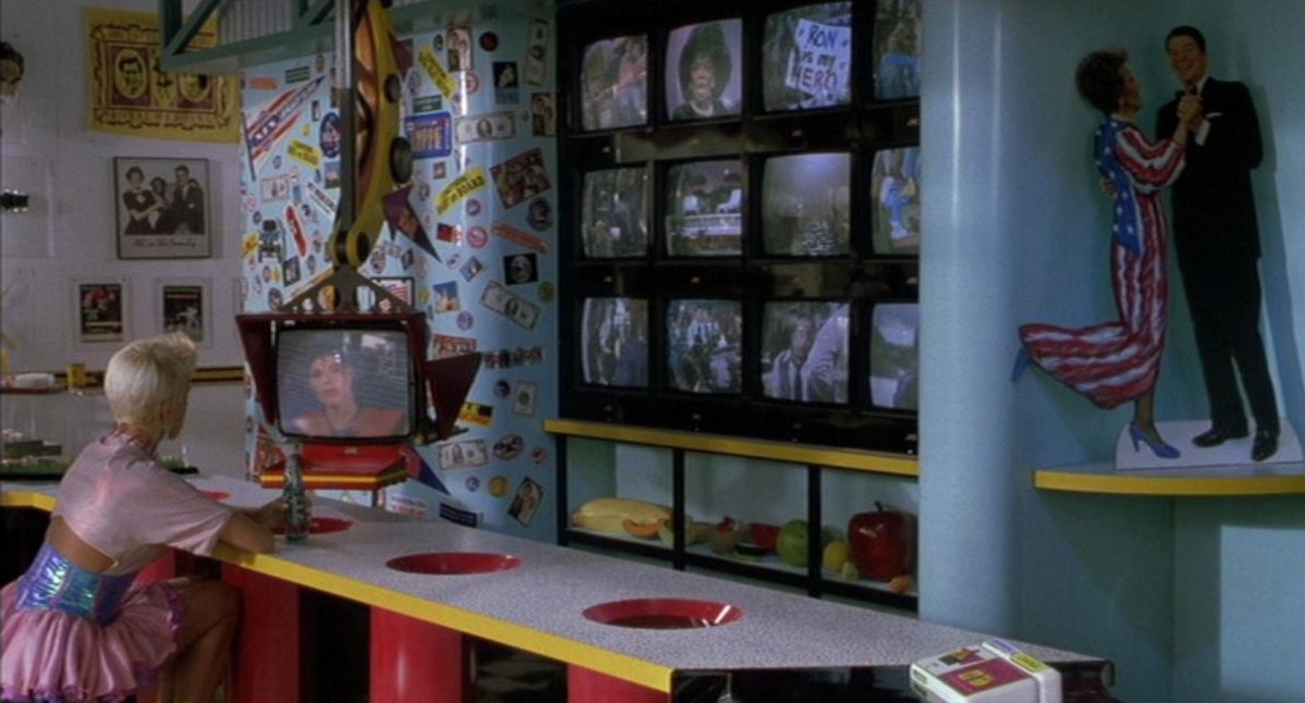 Now we enter the Cafe '80s, and while I've never been to a place like this, I can certainly believe it could exist. You've got Michael Jackson music, a DARE sticker on the wall and some arcade cabinets. The TV screens on robotic arms aren't believable but otherwise this is a pretty good guess at what '80s nostalgia would look like from within the decade. It's definitely a bit too heavy on the Ronald Reagan stuff, though.
