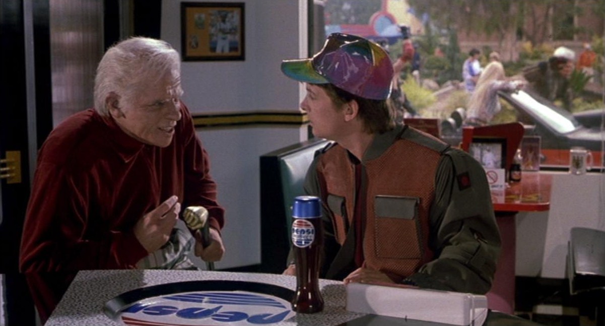 Marty asks the Max Headroom-style Reagan and Ayatollah for a Pepsi. A futuristic plastic bottle, with a label that reads Pepsi Perfect, shoots up from within the counter. Nothing about the bottle or the way it is delivered is recognizable today, but Pepsi is making some of these bottles available for purchase, because of course they are. 2/10, but I'll bump this up to 3/10 if I ever drink one of these.