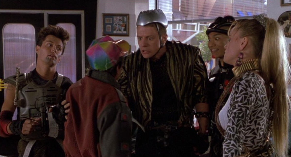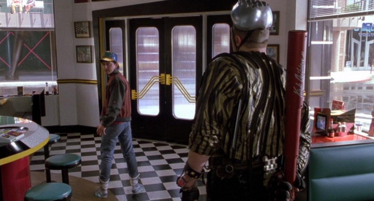 Now we get our first look at Griff and his gang, who are wearing shin pads and helmets and such as some sort of fashion statement. One gang member has computer circuits or some such thing drawn on his face with makeup. That's pretty stupid, but that aside what they're wearing almost looks plausible. Griff has some collection of wires on his wrist, possibly to make his arm stronger, but that's just speculation on my part given the weird hydraulic sound effects that play during the fight scene. (That could be related to those bionic implants Doc mentioned in the alley, or perhaps he was only using a figure of speech?) Griff's ridiculous spiked boots, which we see a lot of during the hoverboard scene, actually look like something I could see a high school kid wearing, although maybe not the sort of typical tough guy bully that Griff is. Maybe those kids' hats messed with my mind but I'm giving the gang's clothes a 7/10.