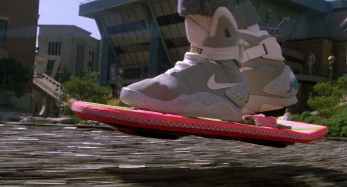 So now we come to the famous hoverboards, which everyone has always wanted to exist but, sadly, they don't. Unlike some of the other modern technology that we see in the movie, the demand for a working hoverboard is not a coincidence: The development of hoverboard technology is fuelled by interest in the movie. But again, the technology we see here, with an electromagnetic board floating across the ground, does not exist. The hoverboard Lexus has shown off only moves across metal tracks, and is much larger than what we see Marty riding - not to mention that it's not for sale and is apparently incredibly expensive to manufacture. The so-called hoverboard Wiz Khalifa was arrested for refusing to get off of at an airport two months ago is in fact an idiotic thing with wheels. This would get a 1/10 because it simply doesn't exist but the relentless need to try to make the hoverboard a real thing bumps this up to 5/10.