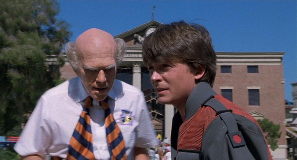 The movie itself starts where the first left off, back in 1985, and before we even get to the future we have some stuff to discuss. First we have Doc Brown, who is wearing a loud shirt, large metallic sunglasses and a translucent tie. I can't claim to have ever seen anything like the tie, but I could imagine someone buying that style of shades, even if the mouthpiece apparently attached is a bit out of place. It's worth noting the large Chinese characters on Doc's shirt, which doesn't look particularly out of place in 2015. Otherwise there's nothing I can point to here as accurate to today, but this is far closer to reality than most of the outfits we'll see, so I'm giving this a 5/10.