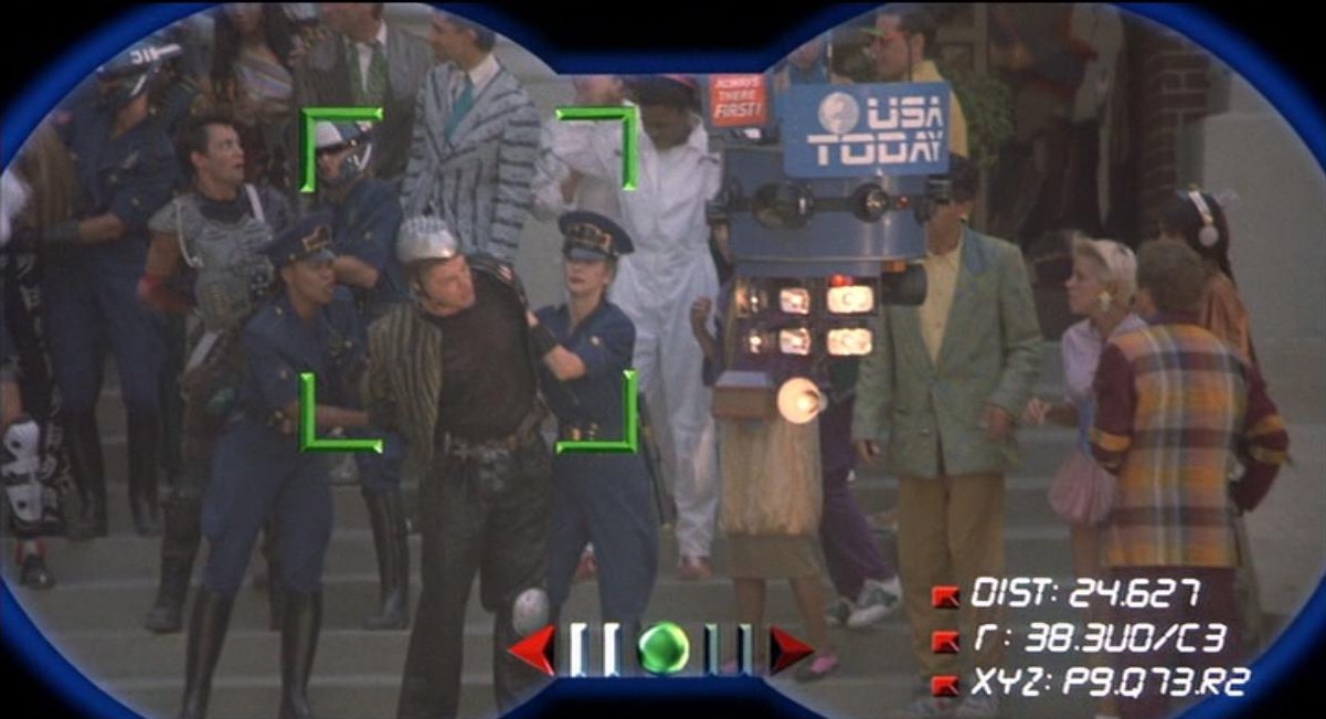 Other bits under Newsline include a story about the threat of terrorists in Switzerland, which I'll give a 7/10 (we don't know much about it, but as a headline it's more plausible today than in 1989), and a story about a woman who is the U.S. president, which obviously isn't the case but appears much closer today than then, so that'll get scored 3/10. There's also a bionic controversy involving a baseball pitcher, which I'll have to give a 1/10 as that's just not realistic. If only the movie had been set 10 years earlier and they went with steroids instead.