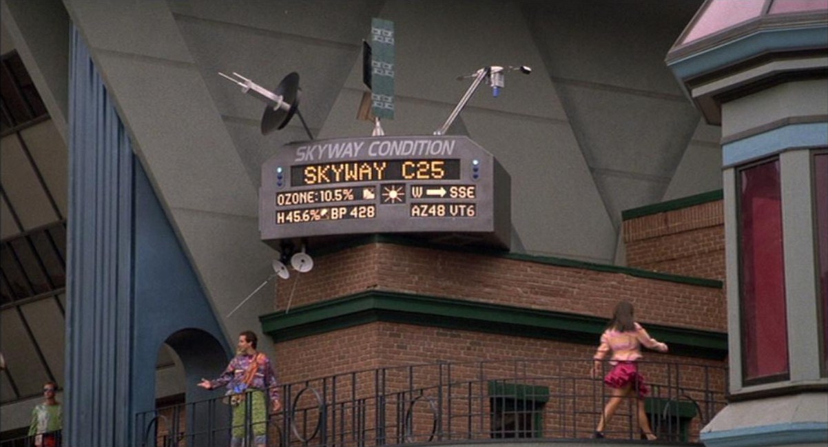 As Jennifer is taken away by the police, Doc looks at the traffic report on a nearby sign. The sign describes some other things, such as the direction of the wind, the humidity and other stuff I can't comprehend, and also an ozone rating. Much like acid rain, the ozone is an environmental concern we don't focus on too much anymore, so that gets a 2/10.