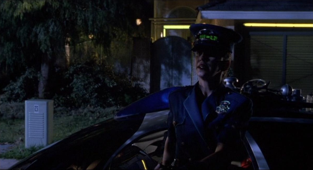 The cops have glowing batons (I don't suppose those work like Tasers!) and digital displays on their hats. Pretty ridiculous, and their uniforms look a bit too much like what you'd expect from a flight attendant, but they look like cops otherwise. Their car, while capable of flight and as swoopy as most of the rest of the vehicles in the film, actually looks reasonably close to what police cars look like today, too.