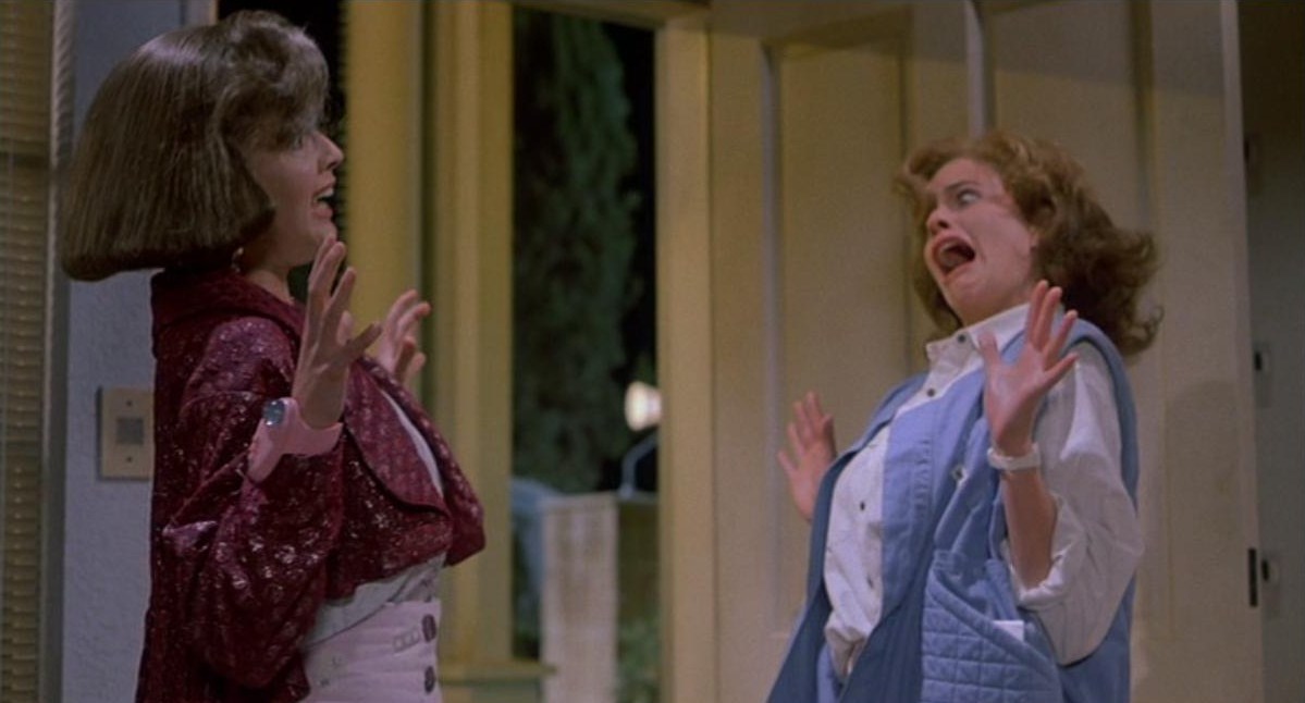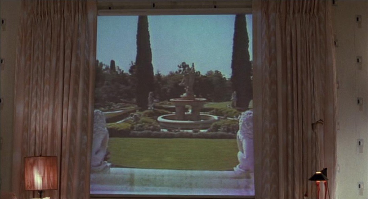 As Jennifer pulls herself together on the couch, we see a broadcast of the Scenery Channel projected against a window blind. People don't project images on the wall in place of a window like this, but in a world where you can watch a burning log on TV at Christmas, the channel itself could exist.