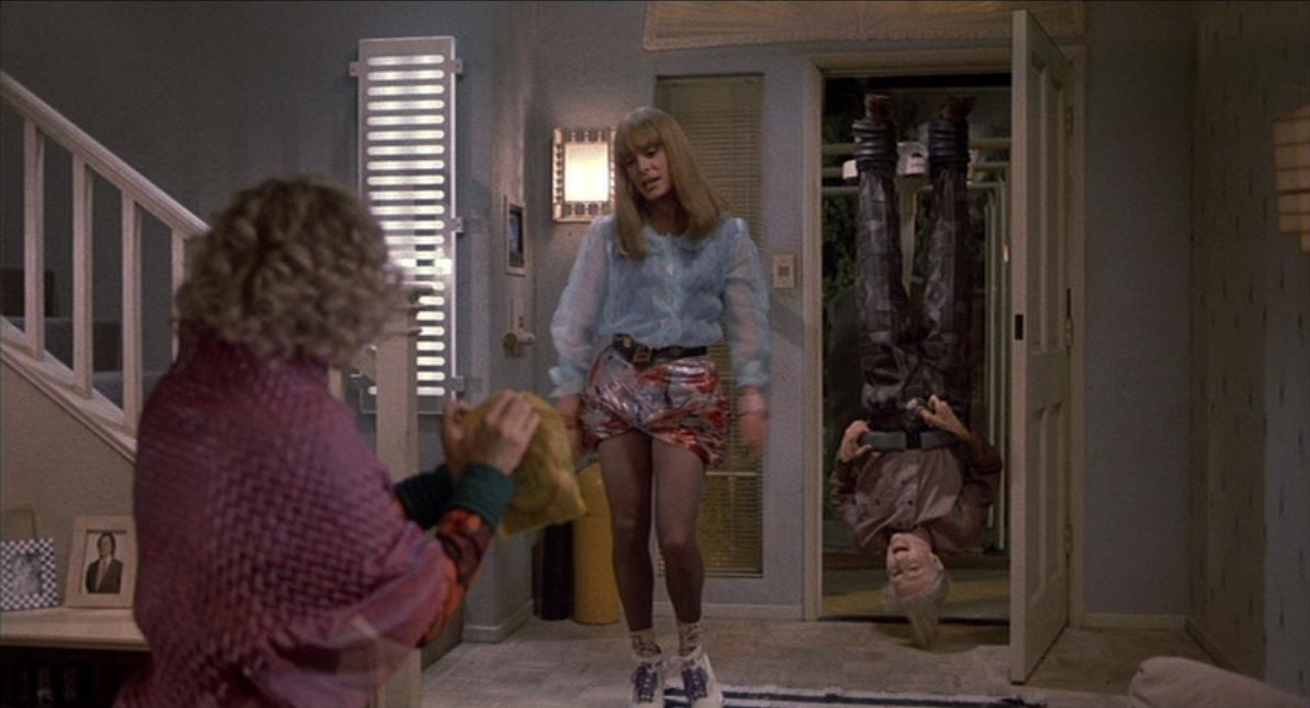 Marty's daughter comes down the stairs and we get a look at her outfit: a pastel puffy shirt, a flashy skirt and a chunky belt with big music notes on it. Ignoring the fact that this is Michael J. Fox in a skirt, this doesn't look especially out of place. With that being said, this would be thought of today as a decidedly '80s look, although not altogether out of fashion. (As an aside, Marty's daughter is referred to as Marlene in the deleted scenes, but I don't think they ever call her by name in the film so I'll follow suit and keep calling her Marty's daughter.)