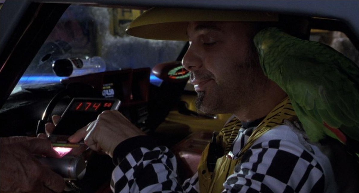 Biff gets out of a cab, which is decked out in several different colours of paint and has ridges on the roof, and the cabbie, wearing an enormous hat and with a parrot on his shoulder, charges him $174.50. Biff pays by placing his thumb against a portable touchpad. This is actually several different things here at once, but they're all equally ridiculous, so the whole scene gets a 1/10. If only the filmmakers tried to predict Uber, they might have scored some much needed points here.