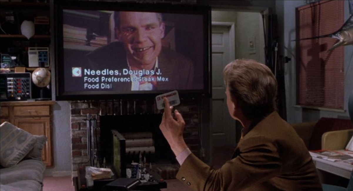 Marty Sr. talks to Needles on the big screen while personal details about Needless pass at the bottom of the TV. The idea of video phones didn't pan out the way people might have envisioned in the 1980s, with things like Skype based on the Internet, but the fundamentals of what we see on the screen do exist. I'll give this a 7/10, as the tech is right but the implementation is off.