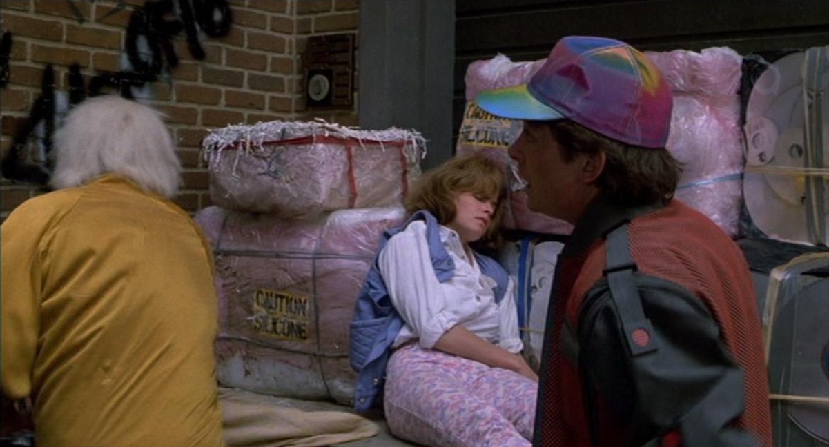 The aftermath of the hoverboard scene sees a bunch of extras standing around, so this is a good point to talk about what the regular folk of 2015 are wearing. We don't get to see many of them up close, but while their clothes are all a little more colourful and streamlined than what you'd see on the street today, there's very little so ostentatious that it strikes me as incompatible with the real 2015. The only piece of clothing that really seems odd is the guy with the blue jacket with the Cookie Monster/shark mouth on it, but I could almost see someone wearing that in real life. One person is carrying a surfboard shortly after the alley scene, which is probably the single weirdest thing here, but who's to say he's not about to fly down to the beach? Also of note, the girl with the hoverboard (not the one Marty steals his pink hoverboard from, the other one) has what appears to be a large ceramic Slurpee cup. I haven't seen one of these, but there are premium cups given away for all sorts of drinks, so it seems plausible enough, I guess?
