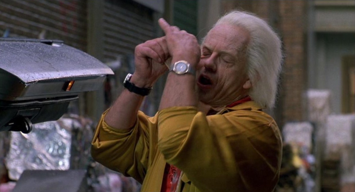 Doc Brown tells Marty and Jennifer they have arrived at Oct. 21, "Twenty-fifteen." Incredulously, Marty responds, "Two-thousand-fifteen?" This is actually rather prescient. Doc has been to 2015 and pronounces it like we would today: Twenty-fifteen. 2015 is just a made-up date for Marty and Jennifer though, so they refer to it in a clumsier way, not hip to how people pronounce years in the 21st century. An off-hand remark but one of the things that the movie got completely right, whether intentionally or not.