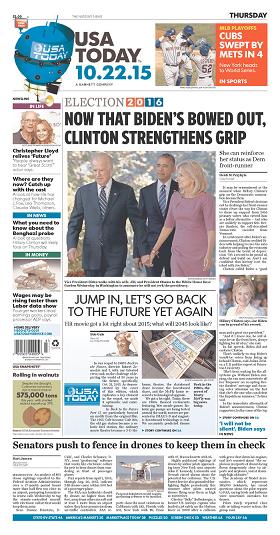 Not really well. No mention of Hillary Clinton on the movie's USA Today (unless we count the complaining president mentioned down the side) but as Bill Clinton wasn't president yet, that's not too surprising. Funny enough there is a mention of a Cubs sweep of a different sort at the top of this paper, too. And of course there's a lot of Back to the Future Part II stuff all over. The drones story at the bottom looks like it could be from BTTF2!