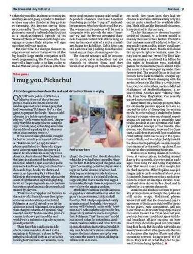 This is a pretty short article, digesting a lot of what you'd read about Pokemon Go in the week before. The headline, which plays off the common "I choose you!" declaration trainers make in the video games and cartoon as they send a Pokemon into battle, doesn't do much to describe what you're about to read. But the fact is I like how evocative it is. Brevity is always great, and in four words the Economist sets the stage: Pokemon, with a hint of violence. I'll rate this a Trapinch because it's small but it has bite.