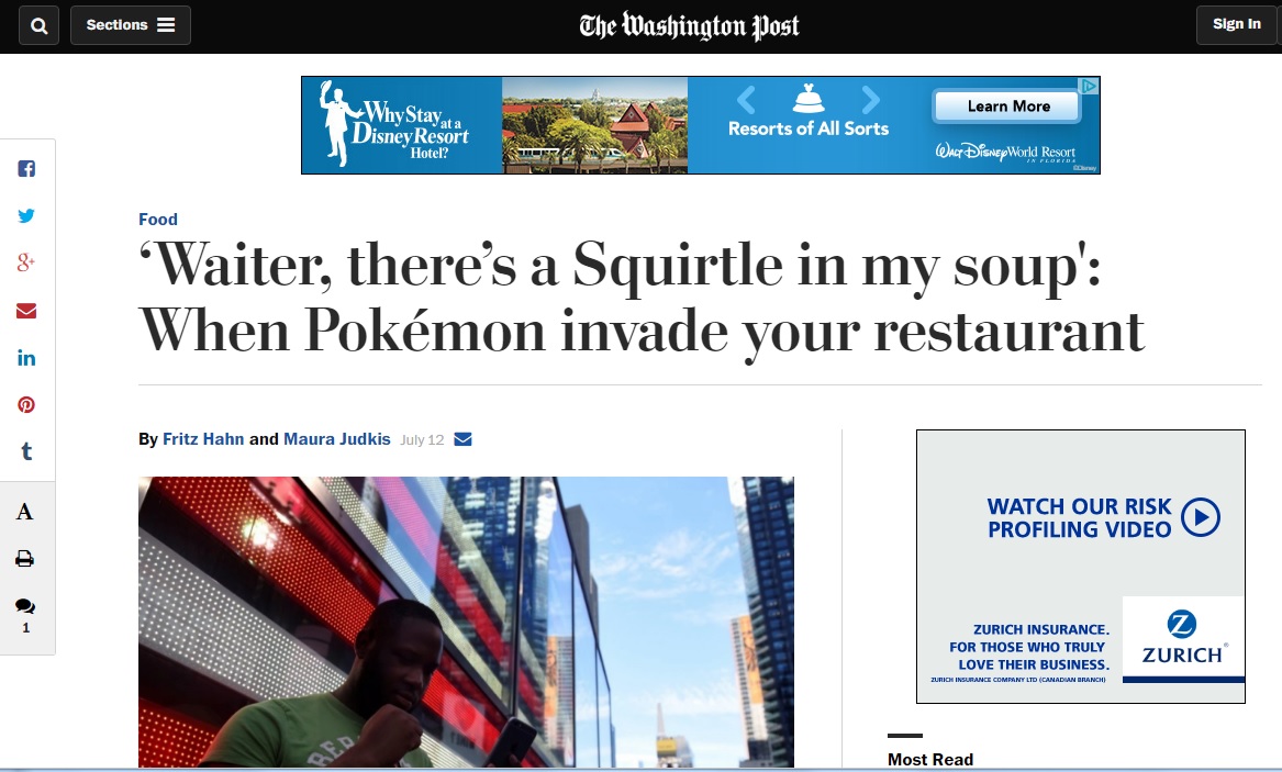 'Waiter, there's a Squirtle in my soup': When Pokemon invade your restaurant, Washington Post, July 12