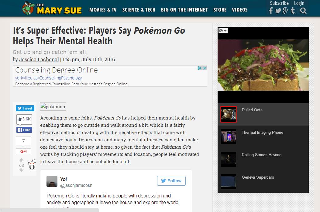 It's super effective: Players say Pokemon Go helps their mental health, themarysue.com, July 10