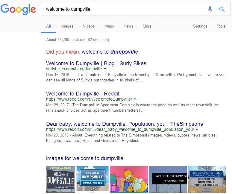 So now we have an idea what went wrong. Now the question is, why did it go wrong? Where did the S come from? Search just the word dumpsville and it appears to have no meaning outside of Simpsons references. Dumpville, however, was the name of a late-19th-century San Francisco shantytown and a small turn-of-the-century Missouri community east of Kansas City. I don't know that either of those were notorious enough to have influenced the Simpsons dialogue.