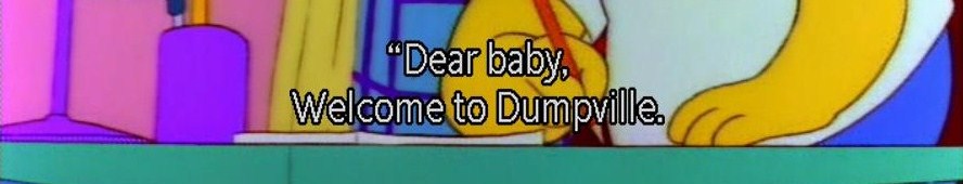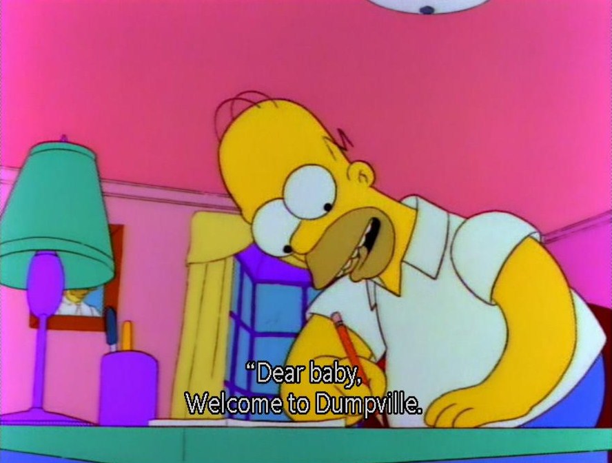 Any real Simpsons fan will recognize the line, and the truly pathetic of us can immediately tell you the context: Homer begins to write a breakup letter on Bart's behalf in the Season 3 episode Bart the Lover. The most pedantic of that group, of which I am apparently a member, will inform you the line is in fact "Welcome to Dumpville. Population: You." Note the lack of an S in Dumpville.